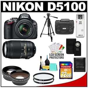 Right now you are searching for Nikon D5100 Digital SLR Camera & 18-55mm G VR DX AF-S Zoom Lens with 55-300mm VR Lens + 32GB Card + .45x Wide Angle & 2x Telephoto Lenses + Remote + (2) Filters + Tripod + Accessory Kit. Purchase this item and anything else you require in terms of all your needs. For secure and reliable service, shop right here at here.