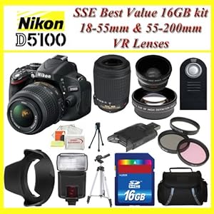 Nikon's D5100 Digital SLR Camera With 18-55mm Lens delivers a galaxy of professional features in a consumer digital camera. A high-resolution 16.2MP DX format CMOS sensor and an EXPEED 2 image processing engine guarantee superb quality and high performance. The 3" vari-angle tilting LCD monitor allows you full freedom in composition with sparkling 921,000-dot resolution. Full 1920 x 1080p video with full-time autofocus (for tracking subjects in motion) and stereo sound (using optional microphone) is always available with in-camera editing and creative controls to bring out your inner director. Factory Supplied Accessories EN-EL14 Lithium-Ion Battery (1030mAh), MH-24 Quick Charger for EN-EL14 Battery, DK-5 Eyepiece Shield (Replacement), DK-20 Rubber Eyecup, UC-E6 USB Cable, EG-CP14 A/V Cable, AN-DC3 Camera Strap, BF-1B Body Cap, BS-1 Hot-Shoe Cover, ViewNX 2 CD-ROM, 1-Year Limited Warranty This Kit Includes:1- Nikon D5100 Digital SLR Camera 1- Nikon 18-55mm VR Lens 1- Nikon 155-200mm VR Lens 1- Wide Angle Lens 1- Telephoto Lens 1- Filter Kit 1- Hard Tulips Lens Hood 1- 16GB SDHC Memory Card 1- USB SD/HC Memory Card Reader 1- Digital Flash 1- Wireless Remote Control 1- Soft carrying case 1- Full Size Tripod with Carry Bag 1- Pack of LCD Screen Protectors 1- Lens/LCD Cleaning Kit 1- Mini Table Top Tripod