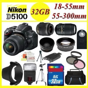 Nikon's D5100 Digital SLR Camera With 18-55mm Lens delivers a galaxy of professional features in a consumer digital camera. A high-resolution 16.2MP DX format CMOS sensor and an EXPEED 2 image processing engine guarantee superb quality and high performance. The 3" vari-angle tilting LCD monitor allows you full freedom in composition with sparkling 921,000-dot resolution. Full 1920 x 1080p video with full-time autofocus (for tracking subjects in motion) and stereo sound (using optional microphone) is always available with in-camera editing and creative controls to bring out your inner director. Factory Supplied Accessories EN-EL14 Lithium-Ion Battery (1030mAh), MH-24 Quick Charger for EN-EL14 Battery, DK-5 Eyepiece Shield (Replacement), DK-20 Rubber Eyecup, UC-E6 USB Cable, EG-CP14 A/V Cable, AN-DC3 Camera Strap, BF-1B Body Cap, BS-1 Hot-Shoe Cover, ViewNX 2 CD-ROM, 1-Year Limited Warranty This Kit Includes:1- Nikon D5100 Digital SLR Camera 1- Nikon 18-55mm f/3.5-5.6G VR AF-S DX Nikkor Lens 1- Nikon AF-S NIKKOR 55-300mm f/4.5-5.6G ED VR Zoom Lens 1- Wide Angle Lens 1- Telephoto Lens 1- Filter Kit 1- Hard Tulips Lens Hood 1- 32GB SDHC Memory Card 1- USB SD/HC Memory Card Reader 1- Digital Flash 1- Wireless Remote Control 1- Soft carrying case 1- Full Size Tripod with Carry Bag 1- Pack of LCD Screen Protectors 1- Lens/LCD Cleaning Kit 1- Mini Table Top Tripod