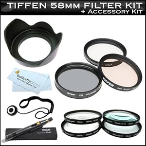 Kit Includes:♦ 1) Vivitar - Vivitar +1 +2 +4 +10 Close-Up Macro Filter Set with Pouch (58mm)♦ 2) Vivitar - Vivitar LCP-1 Lens Cleaning Pen - Removes Dust And Finger Prints Without Scratching Your Device♦ 3) Zeikos - ZE-HLH58 58mm Hard Rubber Lens Hood♦ 4) ButterflyPhoto - ButterflyPhoto Micro Fiber Cleaning Cloth♦ 5) Tiffen - Tiffen 58mm Photo Essentials Filter Kit (UV, CPL, 812 Warming Filter)♦ 6) Zeikos - ZE-LCH1 Lens Cap Keeper - Never lose your cap again!