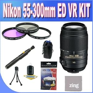 Kit Includes!1- Nikon 55-300mm f/4.5-5.6G ED VR AF-S DX Nikkor Zoom Lens w/All Supplied Accessories 1- UV, Florescent, Polarizer Filter Kit (Protect Your Lens!)1- Lens Pen Cleaner(Protect Your Lens!)1- Lens Pouch 1- Zing MicroFiber Cleaning Cloth (Protect your Lens!)1- Pack of LCD Screen Protectors (Protect from Dust And Scratches!)1- Lens/LCD Cleaning Kit1- Mini Table Size TripodMore About This Lens!Compact 5.5x DX-format telephoto zoom lens with High Refractive Index lens element. ED glass and VR II image stabilization is Ideal for capturing distant subjects at athletic events, family pictures, dramatic sunsets, travel and more.